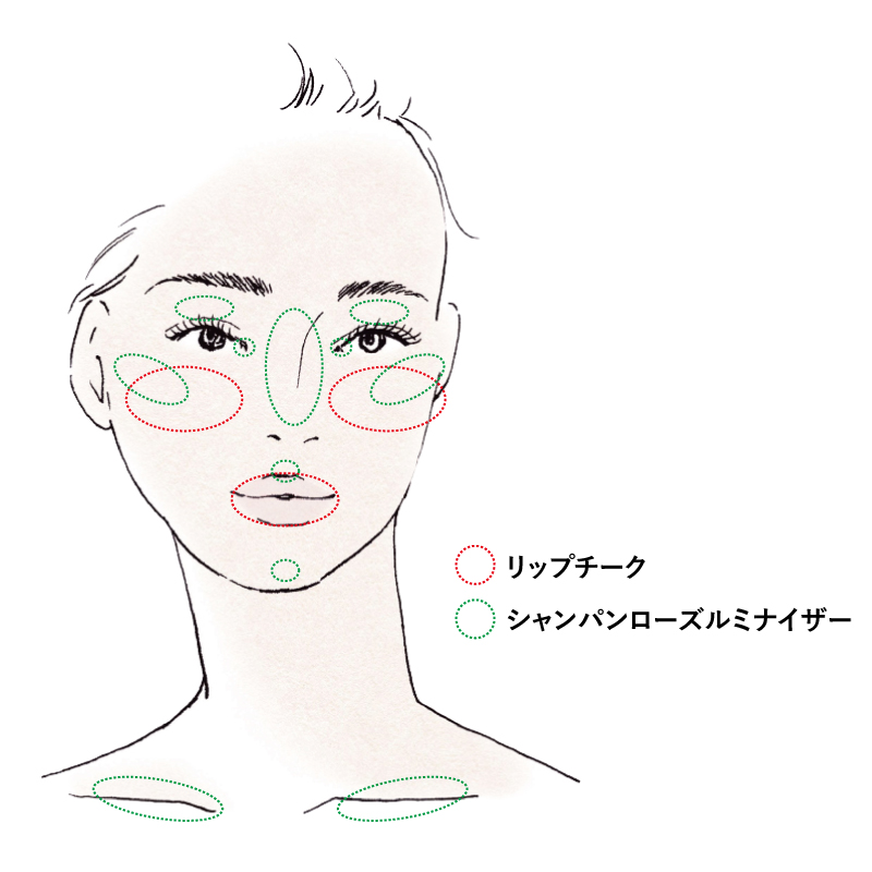 鼻筋には薄くのせて立体感を、上唇の山には少量で口元を印象的に。目頭の“くの字”に入れると、さりげない輝きをプラスできます。