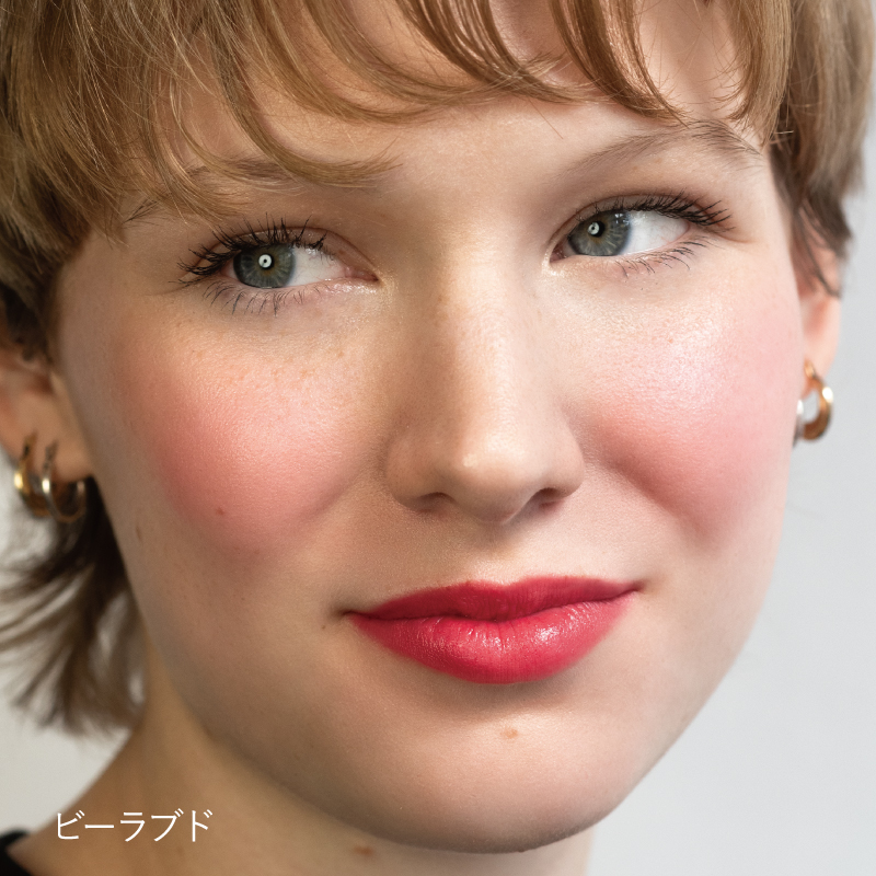 チークとして使う場合は、頬の高い位置に指でポンポンと重ねるか、ブラシで中央から外側へ円を描くようになじませます。